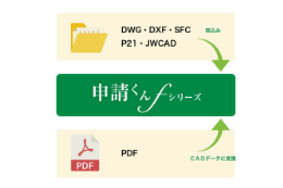 「申請くんf設備」は「申請くんf上下水道」と合わせてご使用いただくことで、設備-CADで作成した設備計画図を上下水道申請図用の部品に変換し、そのまま上下水道申請図面として提出することも可能です。